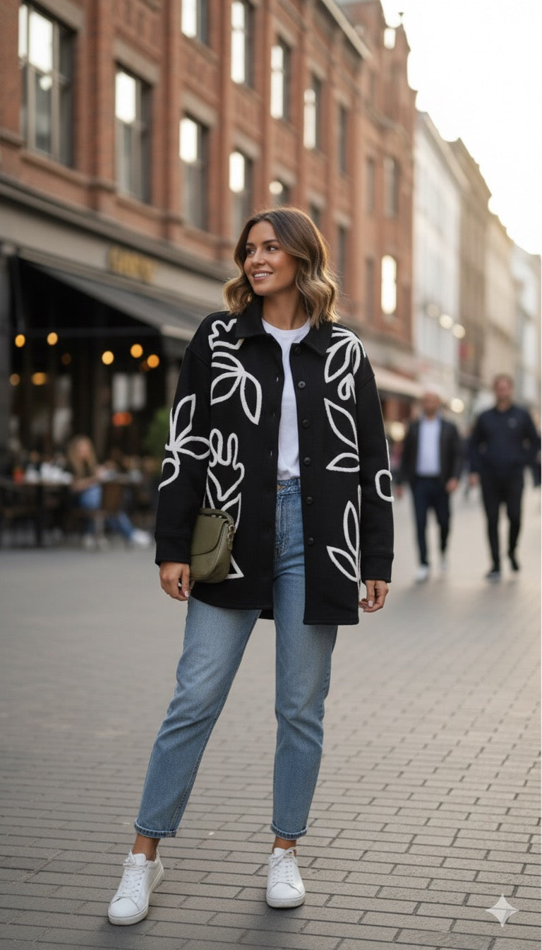 Elevate your style with this chic wool-blend shirt. Designed in classic black with elegant beige embroidery inspired by nature, it adds a modern twist to a timeless piece. Featuring a button-down front and warm fabric, it’s perfect for fall and winter days.